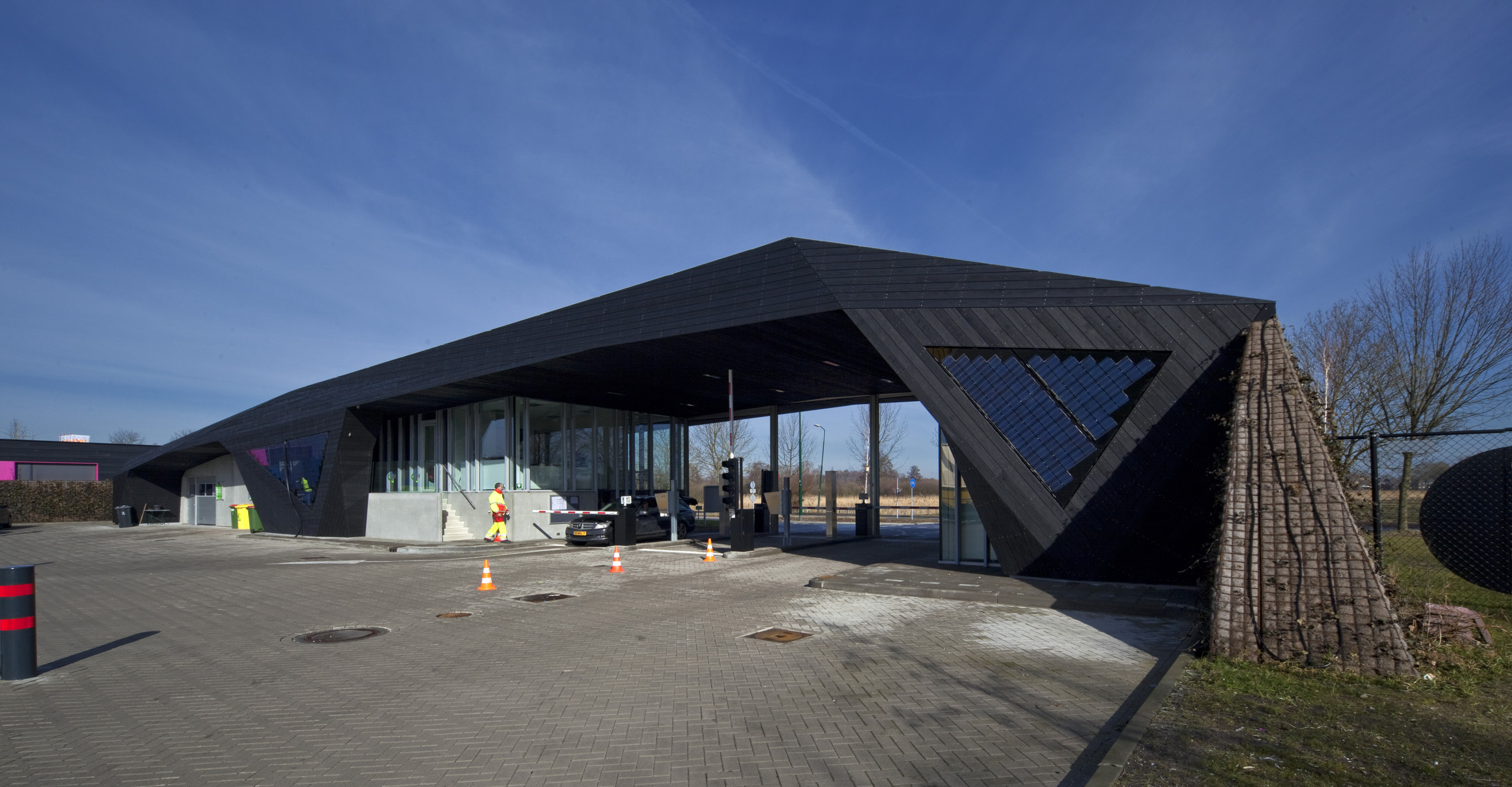 Het door onze studio ontworpen entreegebouw zal voor de burgers het herkenningspunt worden van deze milieustraat. Door de gekozen vorm van het gebouw, waarbij het betonnen karkas is omkleed met verduurzaamde accoya delen, een sedum dak, PV panelen en een greenwall, is het een opzienbare verschijning aan de Wageningselaan geworden.