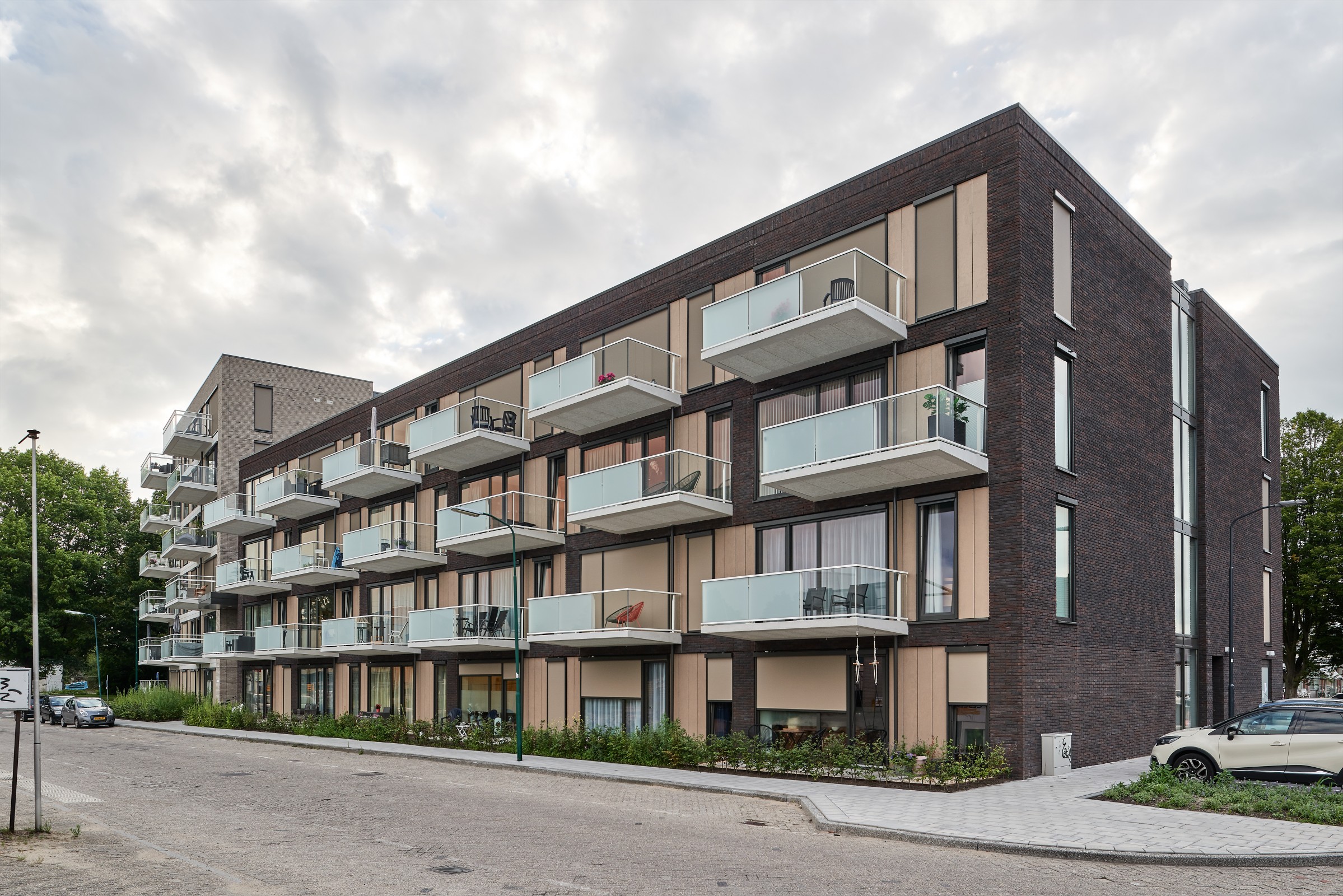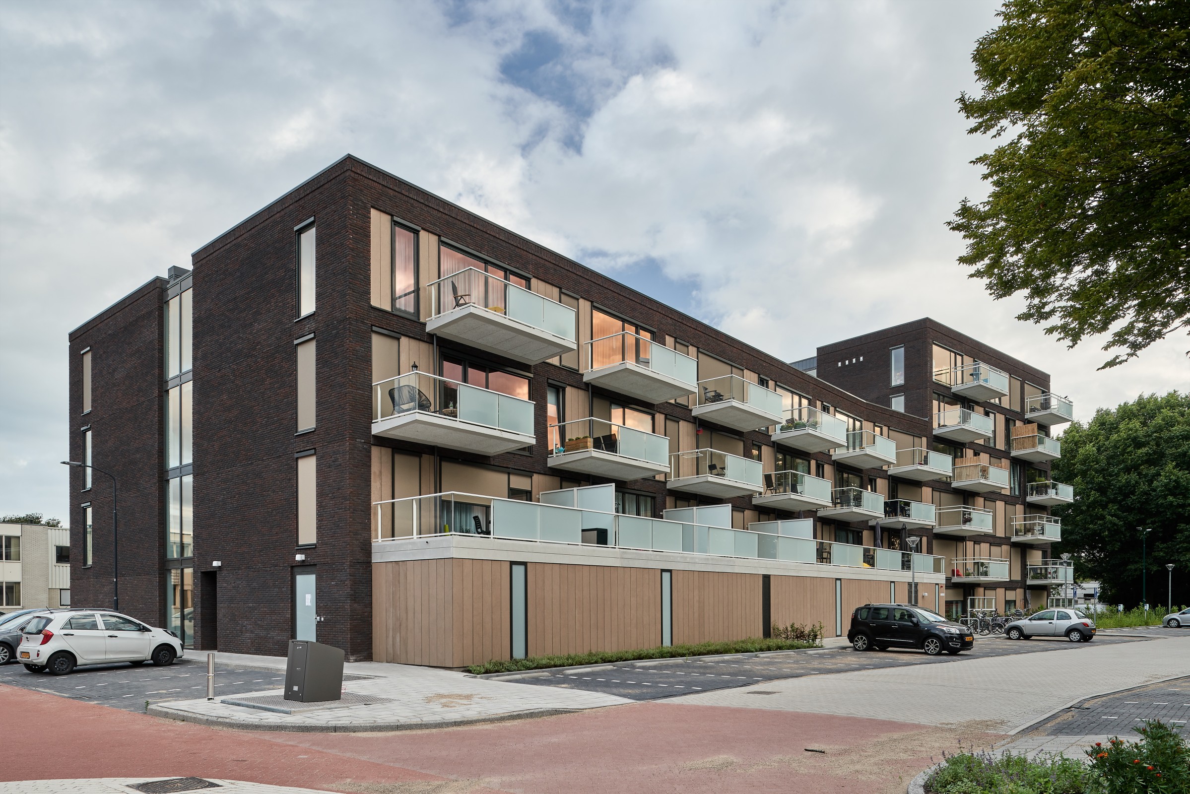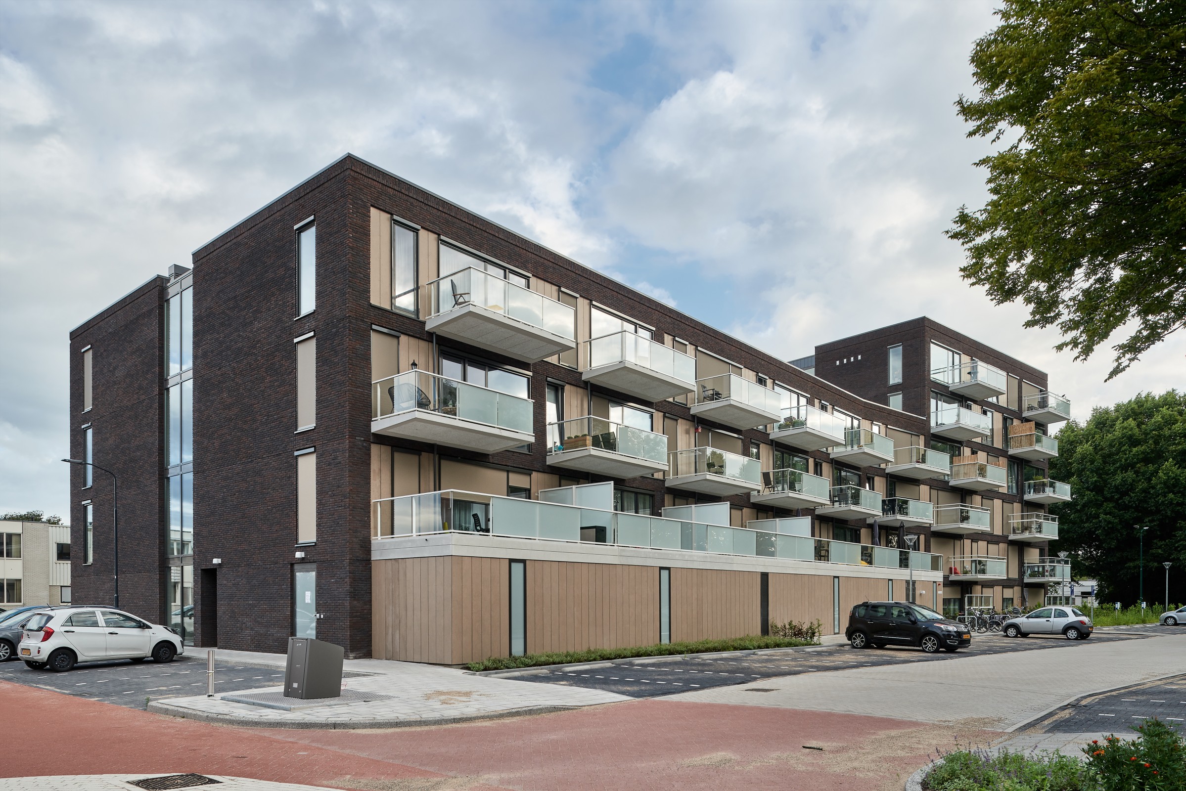 Een woongebouw met een accent op de hoek van het kavel, het gebouw is hier naar de Industrielaan verdraaid waardoor het in zijn stedenbouwkundige setting los komt te staan. Dit wordt extra geaccentueerd door de extra hoogte en de andere materialisatie en vormgeving.